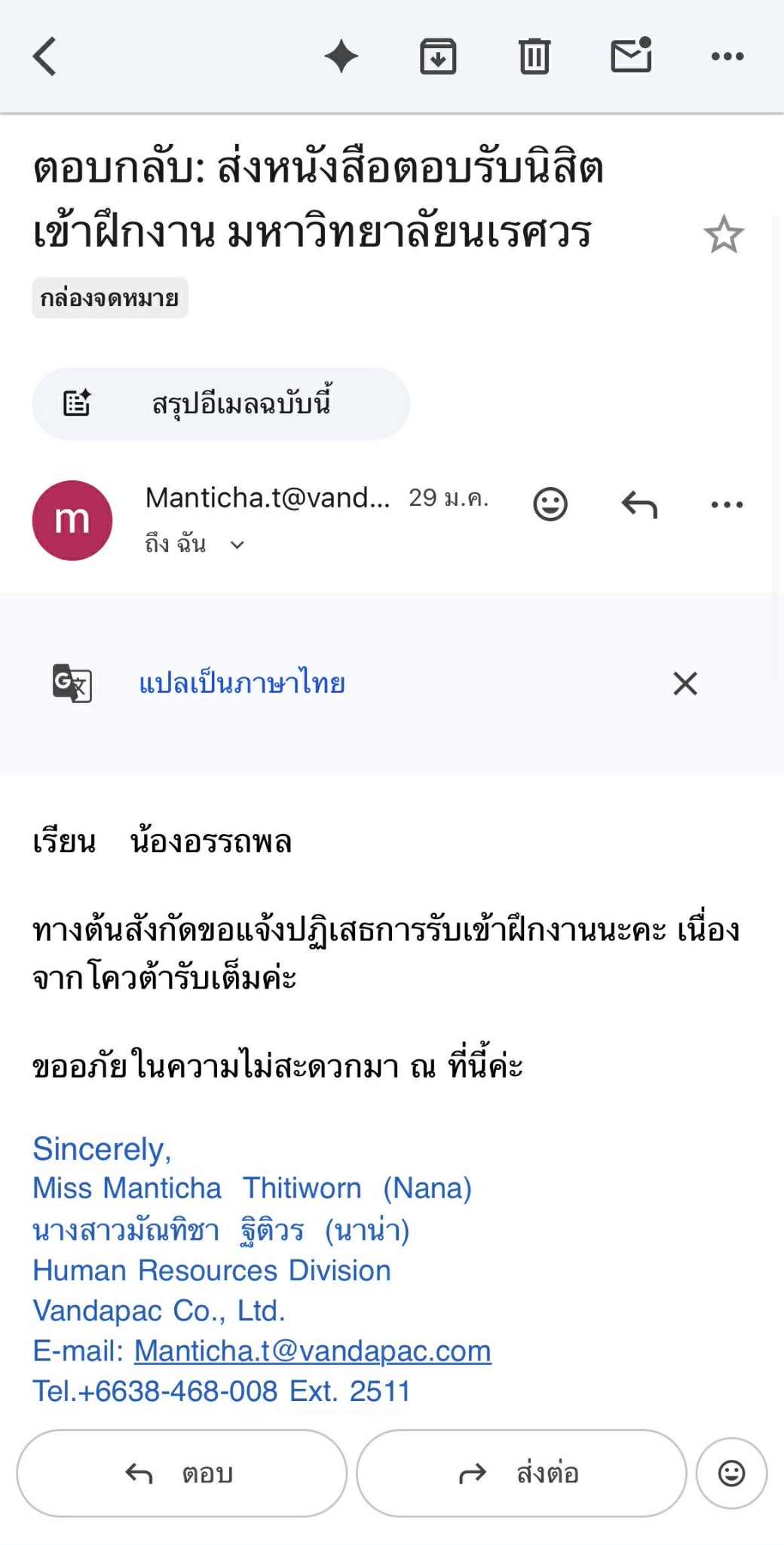 #สาขาวิชาวิศวกรรมเครื่องกล --- บริษัท แวนด้าแพค จำกัด ปฏิเสธการรับนิสิตเข้าฝึกงาน summer/68 *นายอรรถพล ยะถา  [30/01/2569]