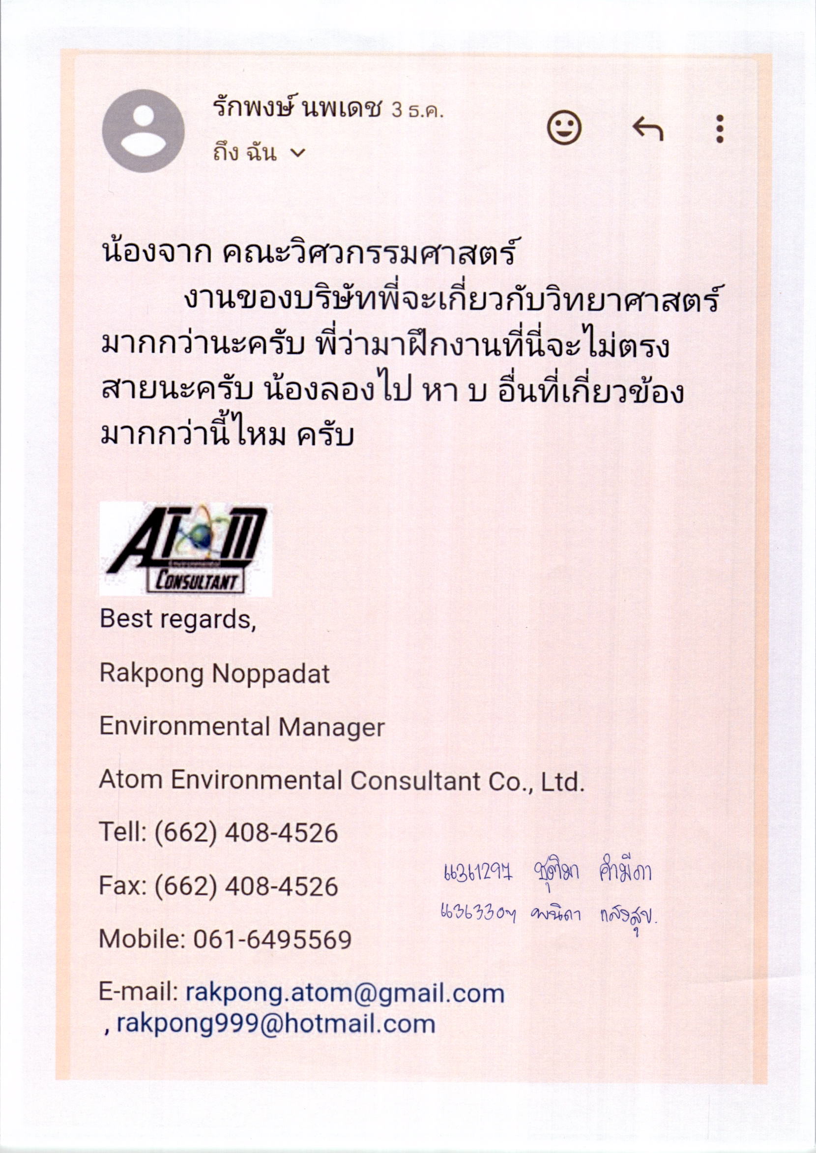 #สาขาวิชาวิศวกรรมสิ่งแวดล้อม --- บริษัท อะตอม เอ็นไวรอนเมนทอล คอนซัลแตนท์ จำกัด ปฎิเสธการรับนิสิตเข้าฝึกงาน summer/68  [15/12/2568]