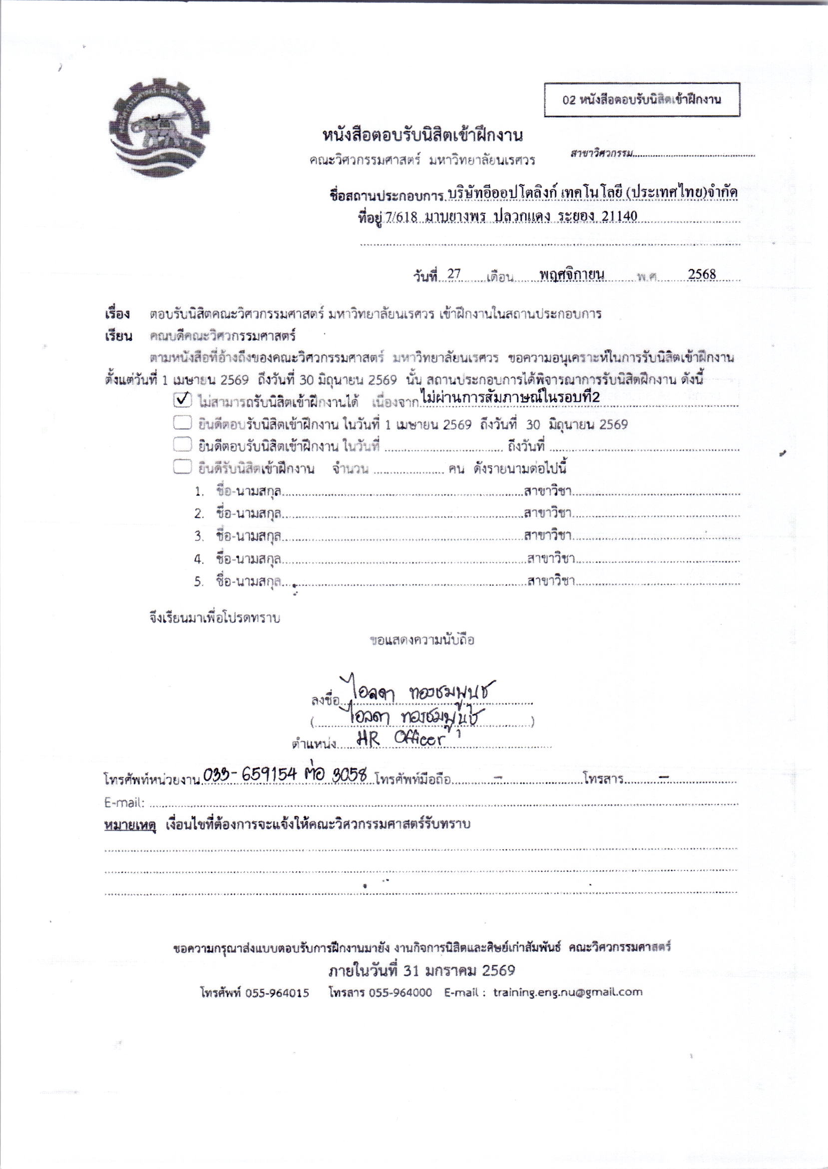#สาขาวิชาวิศวกรรมไฟฟ้า --- บริษัท อีออปโตลิงค์ เทคโนโลยี (ประเทศไทย) จำกัด ปฏิเสธการรับนิสิตเข้าฝึกงาน summer/68  [4/12/2568]